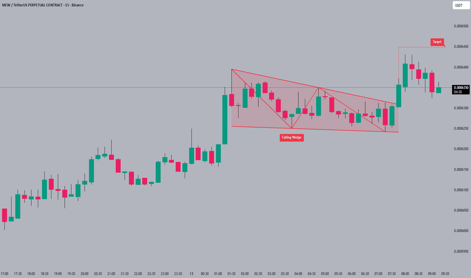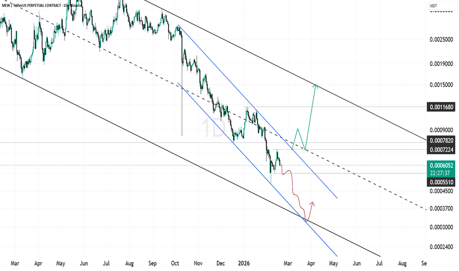 MEW is trading on the Daily timeframe inside a large descending channel that has controlled price action for months. The overall structure is clearly bearish, with consistent lower highs and lower lows. Recently, price accelerated downward inside a sharper internal descending channel, showing strong selling pressure.