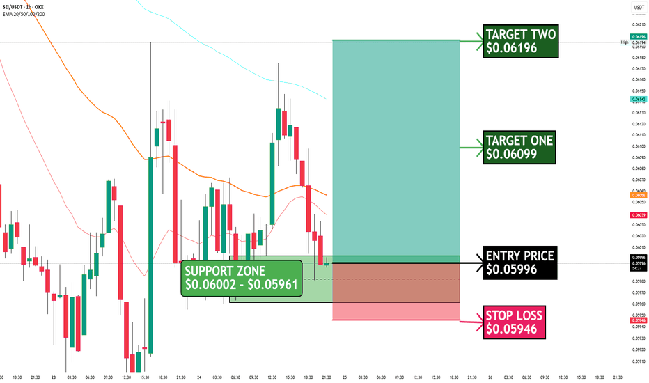 BINANCE:SEIUSDT is showing a clean reaction from a well-defined support zone, and this looks like a classic intraday long setup if momentum follows through. 📊 Price Action Breakdown: After a rejection from higher levels, price pulled back into the $0.0600 – $0.0596 support zone, which has already shown multiple reactions. Buyers are stepping in here again, suggesting this area is being defended. We’re seeing early signs of a potential base formation right at support, which is where you want to look for long entries. 🧠 Structure Insight: Price is currently hovering around key EMAs (20/50/100), indicating a decision zone Repeated wicks into support = liquidity being absorbed If buyers hold this level, a push back toward resistance is very likely This is not a breakout trade yet — it’s a support-based bounce play. 📍 Key Levels: 🟢 Support Zone: $0.06002 – $0.05961 👉 Strong demand area with multiple confirmations ⚫ Entry Zone: Around $0.0599 👉 Best entries come on bullish confirmation (strong green candle / volume spike) 🔴 Stop Loss: $0.05946 👉 Clean invalidation below support 🎯 Upside Targets: ➡️ $0.06099 – First resistance / quick scalp level ➡️ $0.06196 – Major resistance / liquidity zone ⚠️ What to Watch: If price loses the support zone cleanly, this setup is invalidated and downside continuation can follow. No reason to hold if that happens. But if support holds and momentum kicks in, this is a low-risk, high R:R bounce trade. 💬 Final Take: NYSE:SEI is sitting at a key level where moves usually start. Either it breaks down… or it gives a clean bounce setup. Right now, buyers are showing up — and that’s what matters. #SEI #CryptoTrading #Altcoins #TradingView