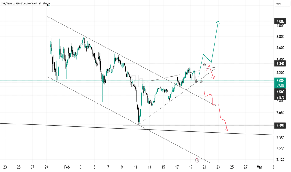 On the Weekly timeframe, XVS remains in a macro bearish trend after a massive decline from its ATH around 147 USDT. The price structure continues to print lower highs and lower lows, confirming long-term bearish pressure. Currently, price is reacting again at a very strong historical demand zone, which has acted as a key support multiple times since 2022. The 3.8 – 2.8 USDT zone (yellow block) represents a multi-year major support area. Price behavior around this zone will be crucial in determining whether XVS forms a medium-term reversal base or continues its bearish continuation / capitulation phase. --- Key Levels on the Chart Major Demand / Strong Support: 3.8 – 2.8 USDT (yellow zone) → Historical institutional demand & accumulation area Step-by-Step Resistance Levels (Supply Zones): 5.7 – 7.0 USDT (minor supply / range resistance) 12.0 USDT 17.3 USDT 38.5 USDT (major resistance / large distribution zone) --- Pattern & Price Structure Explanation Falling Structure (Macro Downtrend): Price has been moving in a lower high – lower low structure since 2021. Base Building / Potential Accumulation: Inside the 3.8 – 2.8 USDT zone, volatility is contracting and selling pressure appears to be weakening — indicating a possible accumulation phase. Range Compression: Sideways price action after a prolonged downtrend often signals a transition phase before a major expansion. At this stage, no strong bullish confirmation yet, but the current price location is highly strategic. --- Bullish Scenario (Reversal / Relief Rally) The bullish scenario becomes valid if: Price holds above 3.8 USDT Strong weekly rejection candles or bullish weekly closes appear Price breaks and closes above 5.7 – 7.0 USDT Bullish Targets: 1. 5.7 – 7.0 USDT (initial resistance / reversal confirmation) 2. 12.0 USDT 3. 17.3 USDT 4. 38.5 USDT (medium-term target / major supply zone) ➡️ As long as price remains above the yellow zone, risk-to-reward for medium-term longs remains attractive, but entries should be scaled and confirmation-based. --- Bearish Scenario (Breakdown / Continuation) The bearish scenario is confirmed if: Price closes weekly below 2.8 USDT The major demand zone fails to hold Bearish Implications: Continuation of the macro downtrend Potential capitulation move Very limited historical support below this zone ➡️ A breakdown below the yellow zone would signal invalidated multi-year demand and significantly increase downside risk. --- Conclusion XVS is currently trading at a critical structural decision zone. The 3.8 – 2.8 USDT area is the last stronghold for buyers. Price reaction here will determine whether XVS can form a medium-term base for reversal or enter a deeper bear market phase. Confirmation is key — not FOMO. #XVS #XVSUSDT #CryptoAnalysis #TechnicalAnalysis #WeeklyChart #DemandZone #SupportResistance #Altcoin #BearMarket #PotentialReversal