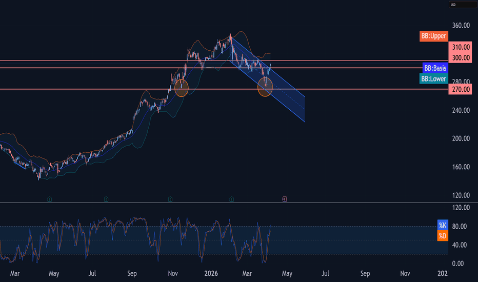 Price at 67.1% Mid of the 349.00 to 162.00 range, meaning GOOGL at 287.56 is sitting in the upper-middle of its visible range. Retrace from prior structure high reads -8% Deep. Bounce from range low is only 5.7% at 0.7x Part — recovery ratio below 1x, partial classification, barely off the recent lows relative to the depth of the retrace. Cascade reads Normal with 5-bar cumulative move at -1%, essentially flat. The price chart shows a relatively contained structure compared to the other names — no dramatic cascade down, no explosive spike up, just a measured grind with a squeeze building and now firing.