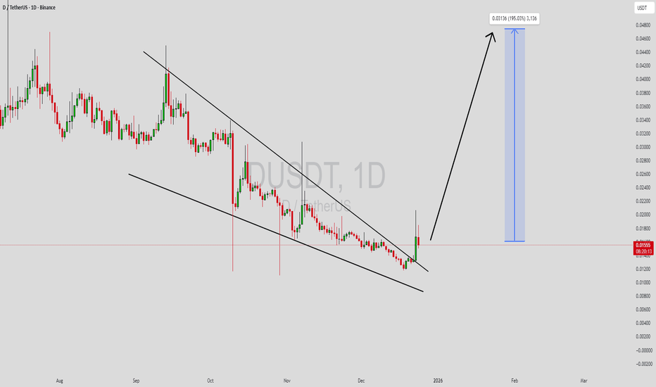 DUSDT is forming a clear falling wedge pattern, a classic bullish reversal signal that often indicates an upcoming breakout. The price has been consolidating within a narrowing range, suggesting that selling pressure is weakening while buyers are beginning to regain control. With consistent volume confirming accumulation at lower levels, the setup hints at a potential bullish breakout soon. The projected move could lead to an impressive gain of around 290% to 300% once the price breaks above the wedge resistance. This falling wedge pattern is typically seen at the end of downtrends or corrective phases, and it represents a potential shift in market sentiment from bearish to bullish. Traders closely watching DUSDT are noting the strengthening momentum as it nears a breakout zone. The good trading volume adds confidence to this pattern, showing that market participants are positioning early in anticipation of a reversal. Investors’ growing interest in DUSDT reflects rising confidence in the project’s long-term fundamentals and current technical strength. If the breakout confirms with sustained volume, this could mark the start of a fresh bullish leg. Traders might find this a valuable setup for medium-term gains, especially as the wedge pattern completes and buying momentum accelerates. ✅ Show your support by hitting the like button and ✅ Leaving a comment below! (What is your opinion about this Coin?) Your feedback and engagement keep me inspired to share more insightful market analysis with you!