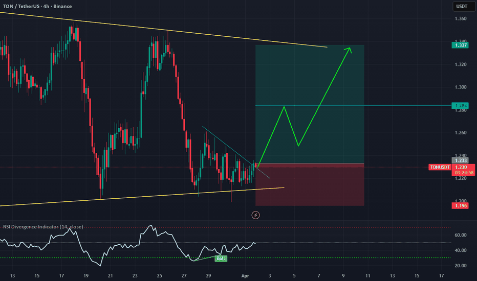 Yello Paradisers! Are you prepared for what could be the most important move on #TON after this perfectly developing structure? 💎#TON has been forming a textbook triangle pattern, and the final Wave E now appears to be completed. What makes this moment critical is the fact that price is currently breaking below the lower trendline of the triangle, signaling that bearish pressure is starting to take control. 💎What adds even more weight to this setup is the strong confluence with the long-term descending channel. The top of Wave E aligned precisely with the upper boundary of this channel, which has been respected consistently over time. Every rejection from this zone has historically led to a move toward the lower boundary, and this time is showing no different behavior so far. 💎From a wave perspective, this structure fits perfectly within a Wave 4 correction. This is a key detail because it suggests that the market is not transitioning into a reversal phase yet but rather preparing for one final impulsive move in the direction of the dominant trend. In this case, the trend clearly remains bearish. 💎At the moment, price is positioned between key levels that will define the next move. Minor support is located around 0.92, while the major support aligns with the lower boundary of the descending channel near 0.77. On the upside, minor resistance sits around 1.38 at the Wave E high, and stronger resistance is found near 1.78. As long as price continues to trade below these resistance zones and respects the channel structure, the probability strongly favors a continuation toward the lower support levels. 💎The recent rejection from the top of the channel further reinforces this expectation. Markets that follow a trend tend to move systematically from resistance to support, and #TON is currently respecting this behavior with precision. Until proven otherwise, there is no confirmation of a reversal—only continuation. So the real question is, will you stay disciplined and follow what the market is clearly showing, or will you try to predict a reversal before it actually happens? Paradisers, strive for consistency, not quick profits. Treat the market as a businessman, not as a gambler. MyCryptoParadise iFeel the success🌴