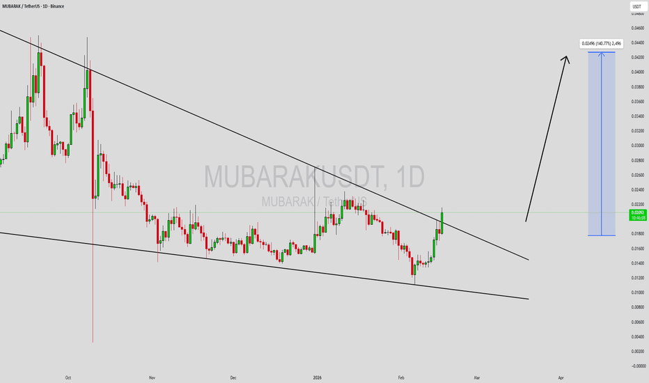 Mubarak is rising, it reveals something. This is now a community-owned meme coin... Look at its chart. The low happened 6-February, it is the same. The same as Bitcoin and the other projects, it is moving ahead. There was a small pause yesterday and today a continuation. The current move is a recovery but also a resumption because the bottom didn't happened 6-Feb but rather on the flush, October 2025. It seems it will continue rising and this is supported by volume. It is supported by the rest of the market. I know that strong bullish action starts tomorrow and it will spread marketwide. MUBARAKUSDT is up more than 90% since its 6-February low. I have two targets for you, both can be hit short-term, within 30 days. While this is possible, we always prepare to wait longer, much longer if necessary. So the time window becomes mid-term, within 90 days. The first target is $0.049 and this gives us 145% potential for profits. The second target is the main one and this opens up 450%. We are aiming for the second target. It should be a swift and easy move. It is likely to be smooth. The bearish force was exhausted long, long ago. Mubarak produced an extreme low and it doesn't need to be revisited anytime soon. Up next. To me this chart reveals the broader mood of the market. A young bullish move that is soon to intensify. Young but good as it has been in the making for months. The longer the consolidation period, the stronger the bullish move that follows. We are getting very close. It will be fun. Namaste.