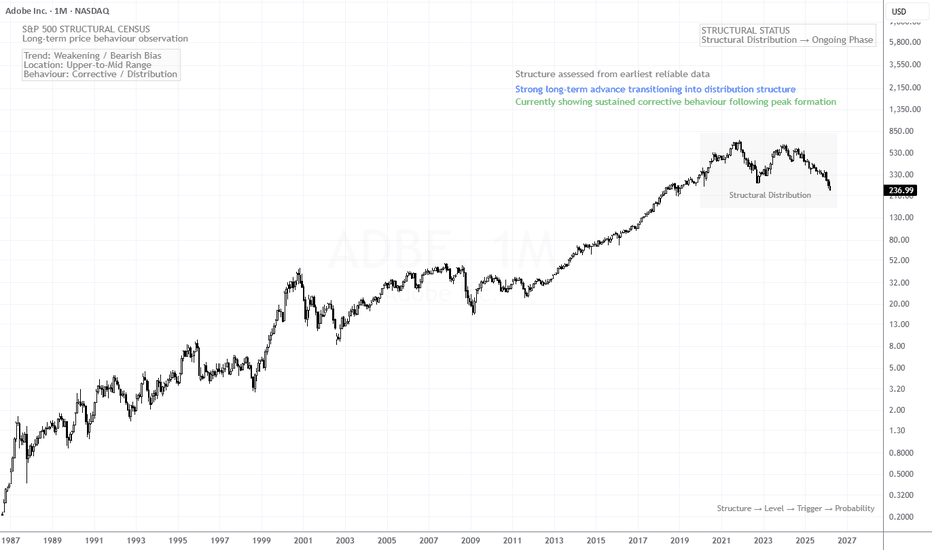 Adobe remains fundamentally strong with solid growth and exceptional margins, but sentiment continues to be bearish. AI disruption concerns are valid, though likely overdone at current levels. Add in uncertainty around the CEO transition and broader market weakness, and you get sustained downside pressure. Technically, the $255–270 support is failing, opening the door lower. The next key zone sits around $205–210, a high-confluence area: Long-term horizontal support (dating back to 2018 lows) Multi-decade trendline support (6 prior touches) RSI Oversold (Weekly, Monthly) Beta-implied downside alignment If the S&P 500 (SPY) retraces ~10% toward ~$570 by November 2026 which would target a full weekly gap close (the only one remaining) and a retest of long term support trendline, by applying ADBE’s ~0.98 beta, this implies downside ~$210, cleanly matching this technical zone. One key aspect to be watching is the Monthly 9EMA which has been suppressing ADBE since September 2024 - reclaiming it is critical for sustained upside Despite the drawdown, valuation is becoming compelling. Proprietary Fair value models imply ~$380 giving investors ~45% margin of safety at $210. Trade Plan Aggressive: scale in near $205–210 with tight risk below support Conservative: wait for monthly close above 9EMA (key trend shift trigger) Bottom line: $205–210 is the level to watch. Without reclaiming the monthly 9EMA, rallies are likely to be short-lived. Monthly: *note: included 9EMA forecast